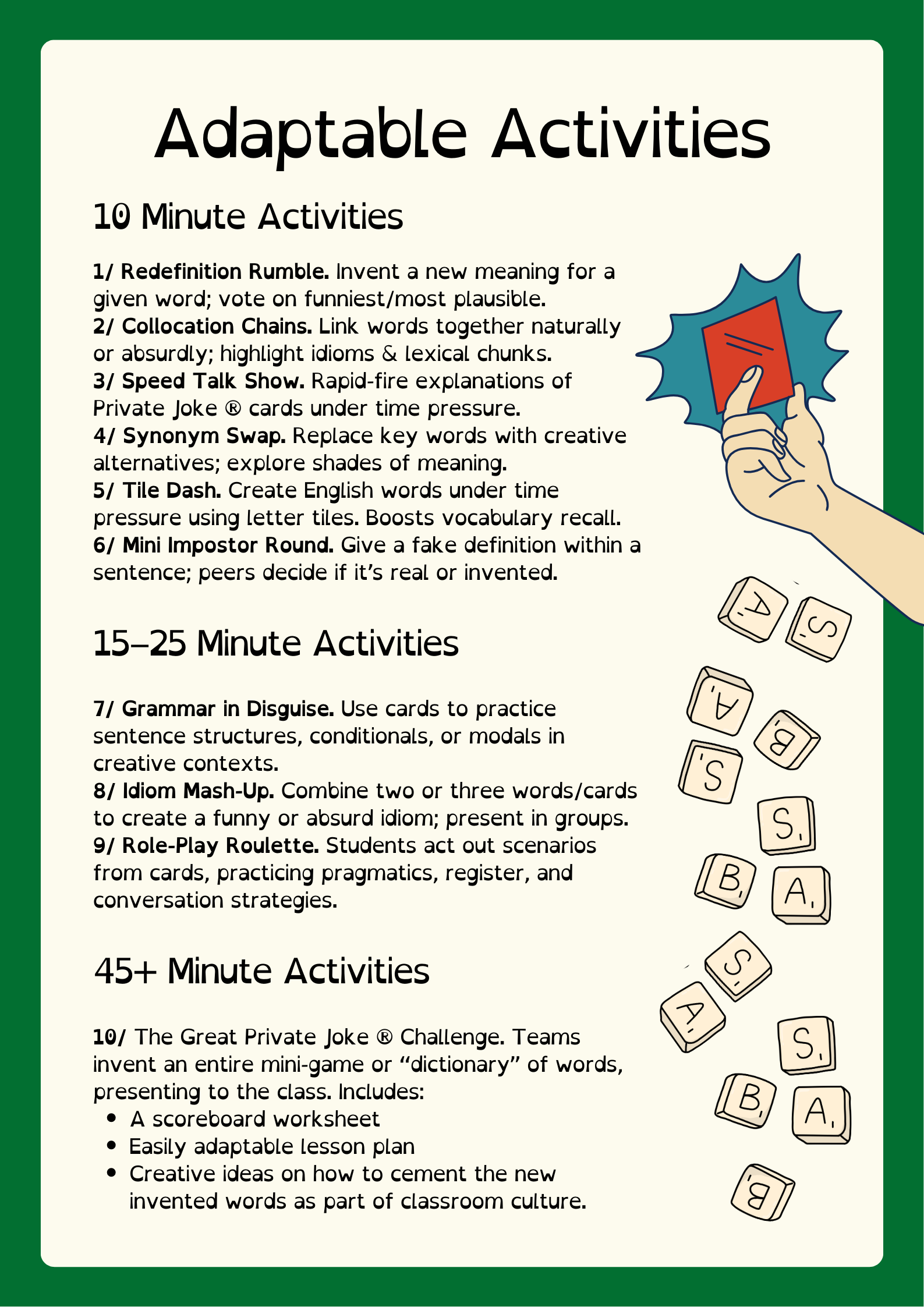 10 flexible, adaptable activities designed for print, cut, and play in any classroom. From quick 10-minute warm-ups to 35+ minute deep-dive challenges, each activity works for groups of 4–8 and is perfect for boosting vocabulary, speaking fluency, and creative thinking. The Educators Edition (of course) includes 90 x letter tiles, 36 x Private Joke ® cards, as well as 18 x empty cards for the The Grand PJ Challenge!