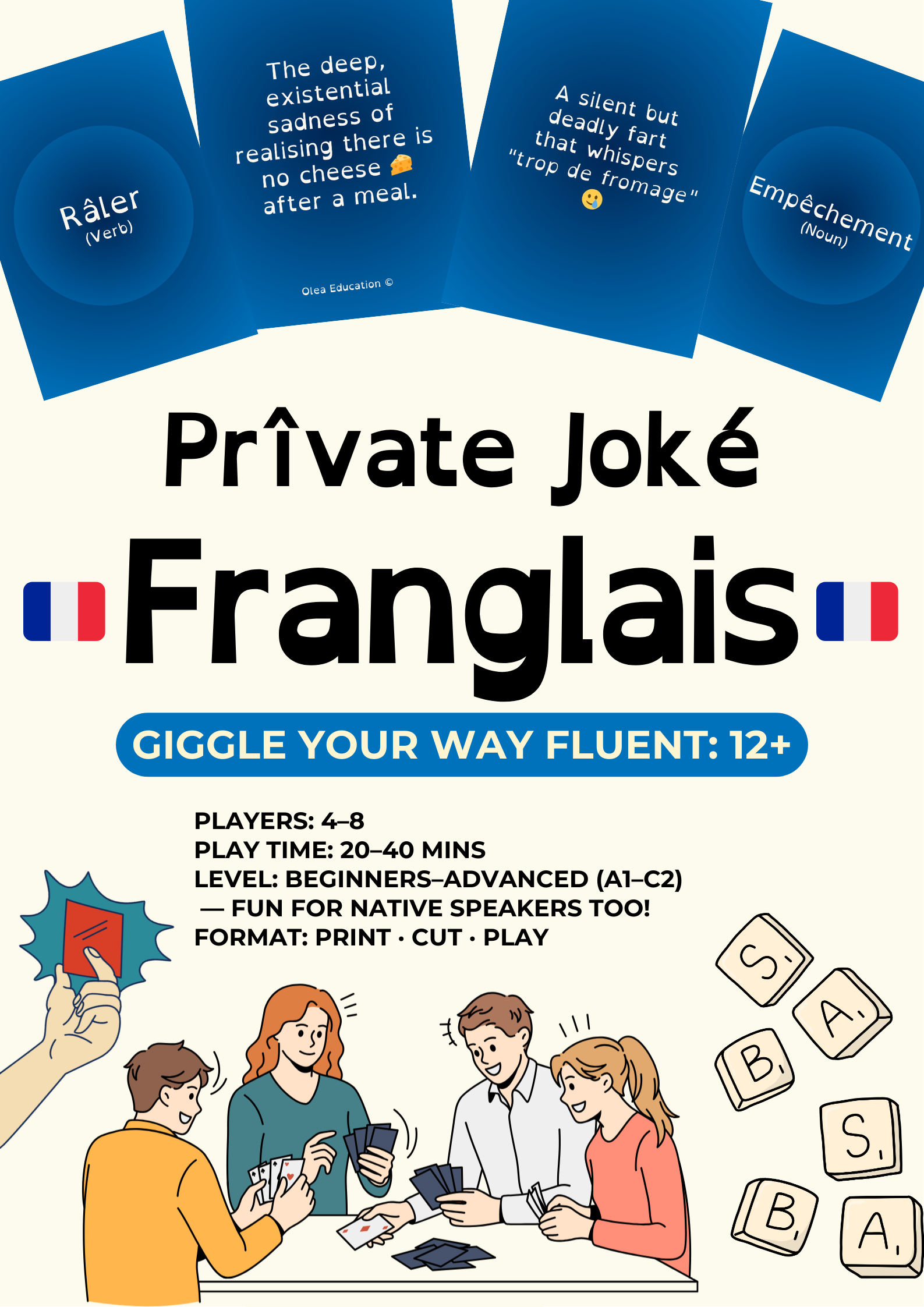 If you love French humour, wordplay, and cheeky creativity, Private Joke ® Franglais is your new go-to game. Ready to speak like a local, laugh until you cry, and become a proper Franglais nerd? Let’s play.